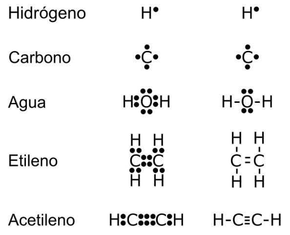 Observe que los electrónes son representados por puntos, y cuando hay dos que pueden formar un enlace, se pueden sustituir por una línea.